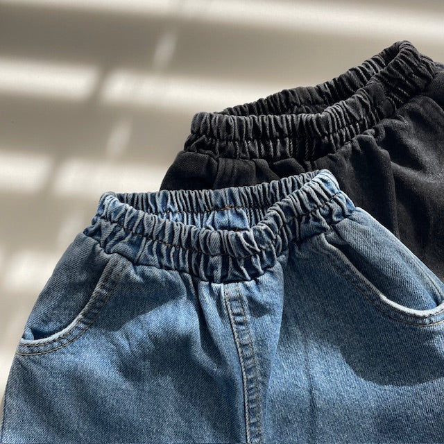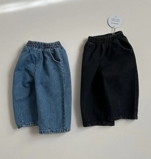 Classic and comfy, these 100% cotton denim dart pants feature an elastic waistband, front and back pockets, and stylish darts at the leg openings. The oversized baggy silhouette offers freedom of movement for toddlers and kids. Available in blue or black denim, perfect for everyday wear.